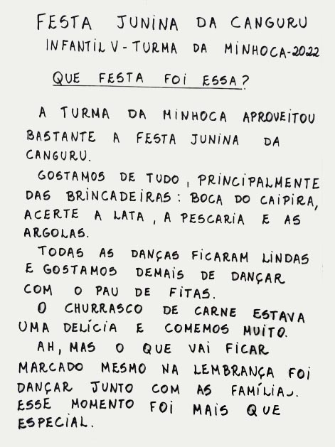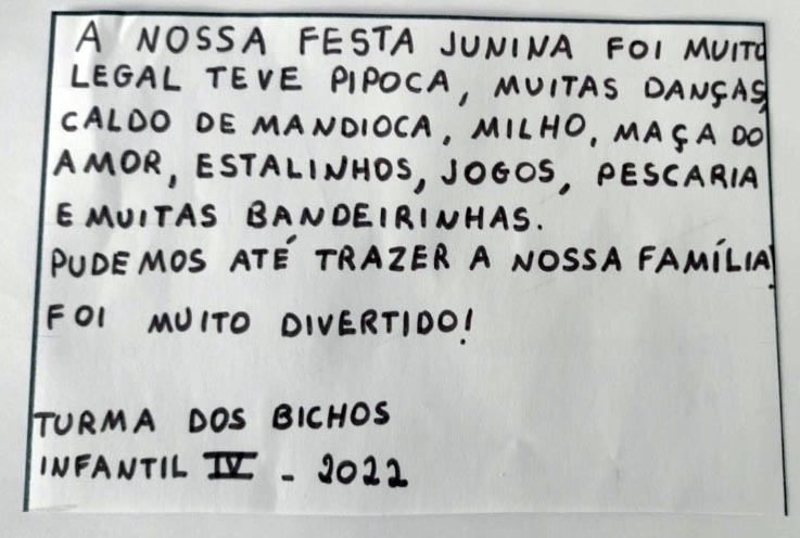 Depois de um longo período de pandemia, em que algumas crianças não vivenciaram essas tradições e que outras viveram pela primeira vez uma Festa Junina, foi marcante apresentá-la aos pequenos e pequenas através de sua origem, de suas raízes, de seus elementos e tradições.