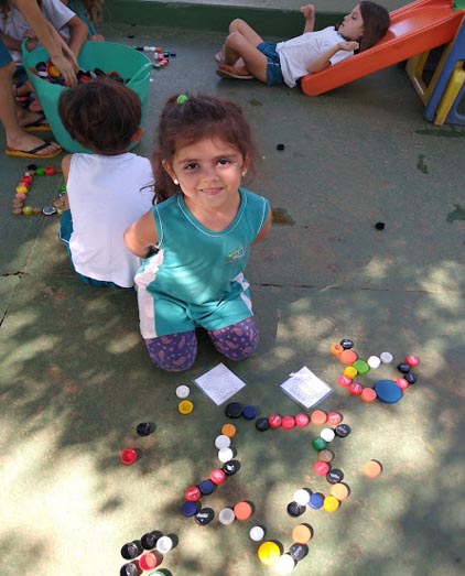 O Infantil V, Turma do Sol, começou em março desse ano uma coleção de tampinhas. Essa proposta oferece um contexto riquíssimo para explorar as ideias matemáticas como contagem, somar, subtrair, classificar, seriar, jogar e muitas outras.