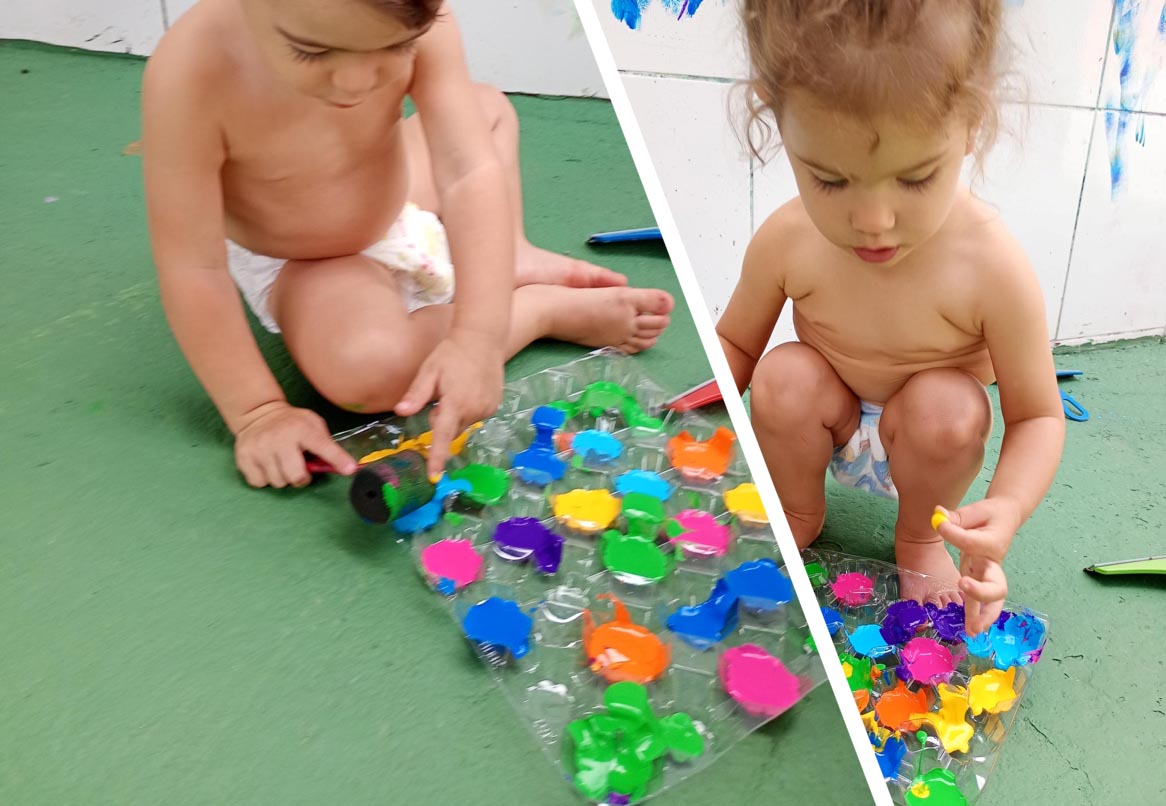 Durante a proposta, foram disponibilizados diferentes suportes para que cada criança pudesse explorar a tinta de maneira que fizesse mais sentido para ela. algumas utilizaram objetos para pintar o azulejo, enquanto outras sentiram a necessidade de passar a tinta pelo corpo, como foram os casos da Luísa, Mel e Manuela. Joaquim demonstrou grande interesse em explorar ao máximo o azulejo, cobrindo toda superfície com cores e formas. Já Isabela se destacou pela maneira cuidadosa como segurava o pincel, criando suas pinturas com precisão e delicadeza. Miah demostrou concentração e capricho ao explorar as misturas de cores. Já Rafael aproveitou para explorar as misturas de cores, testando diferentes formas de aplicação da tinta e observando as mudanças que aconteciam no azulejo.